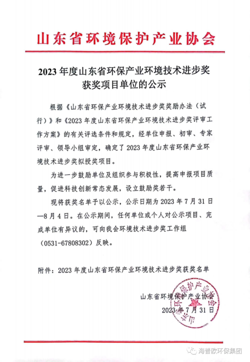| 山東省環保產業環境技術進步獎 | 省級 | 山東省環境保護產業協會 |