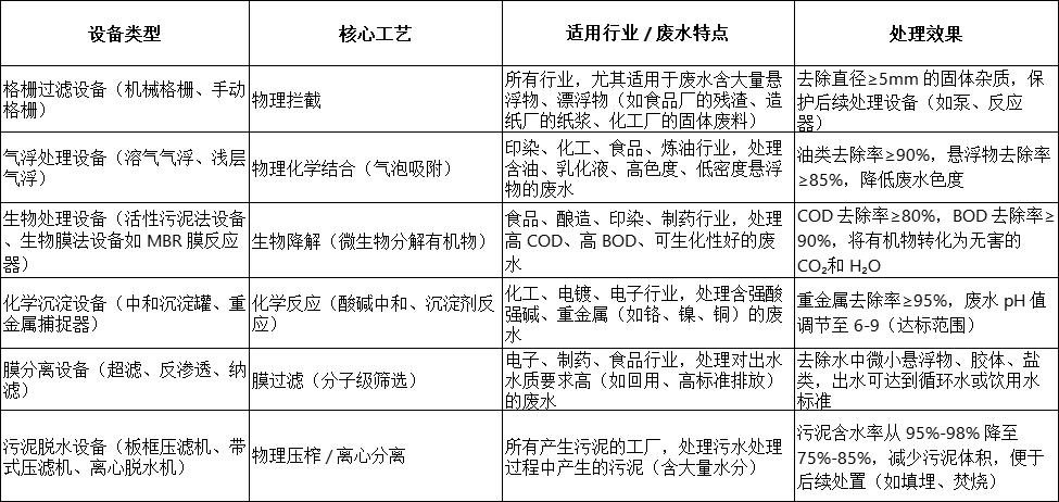 不同行業的工廠廢水成分差異極大(如化工廢水含強酸強堿、重金屬,印染廢水含高色度、難降解有機物,食品廢水含高 COD、高懸浮物),對應的污水處理設備也需 “對癥下藥”。以下是常見設備類型及適用場景: