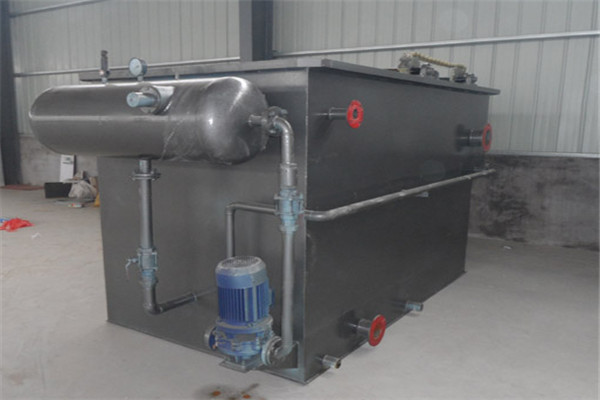 平流溶氣浮機(jī)將部分待處理水加壓至0.3-0.4兆帕,與壓縮空氣同時(shí)進(jìn)入容器罐,在容器罐中完成溶氣過程(空氣充分溶入水中)。溶氣水通過管道進(jìn)入安裝在氣浮池接觸室的溶氣釋放器。釋放器將溶氣水壓力突然降至常壓,釋放器釋放出微小的氣泡。氣泡與顆粒接觸粘附后,在氣浮分離室進(jìn)行固液分離。出水通過穿孔集水管均勻收集,送入下游處理單元。浮渣被刮渣機(jī)刮進(jìn)排渣槽,沉淀的污泥從污泥斗排出。